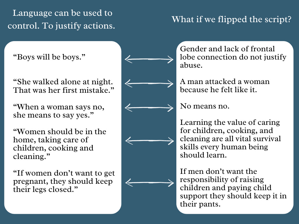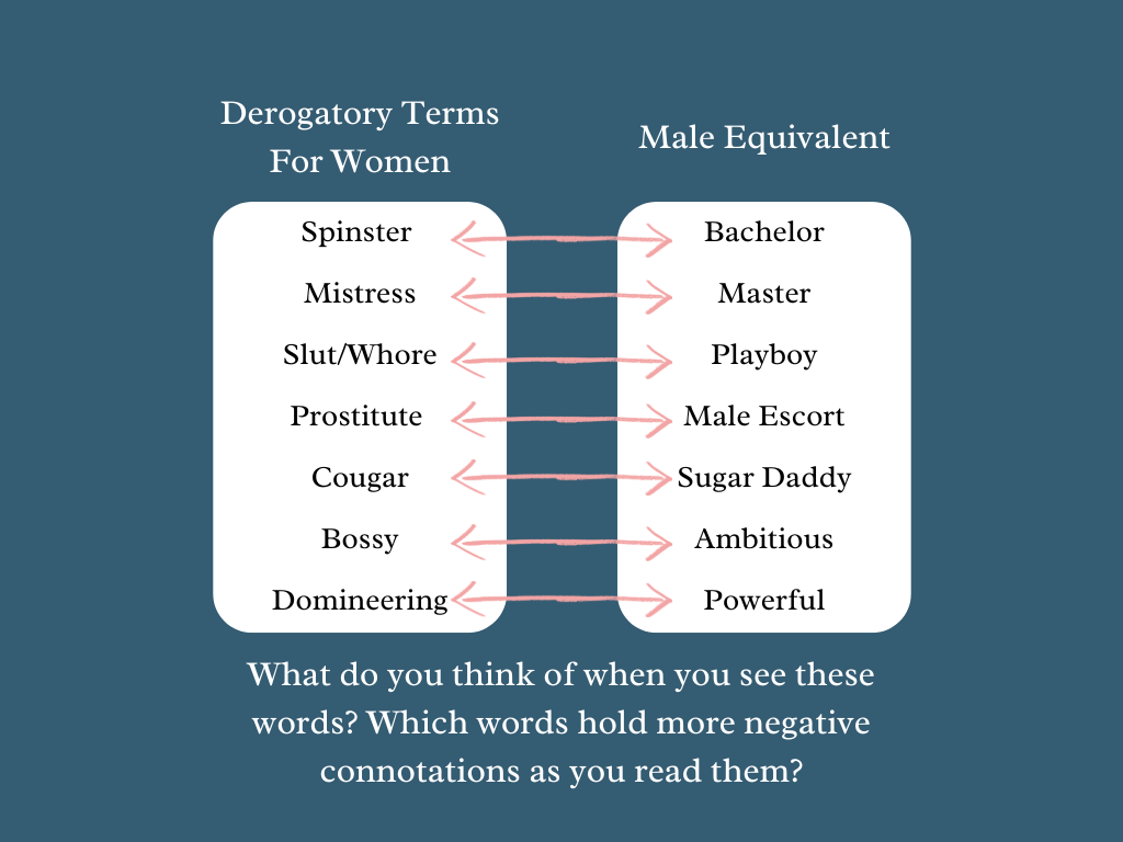 Often, it's not necessarily one word, but multiple. Sentences can be just as powerful at degrading and dehumanizing women, that we don’t even notice it. They become ideas and morph into morals that dictate how humans should live, and perhaps more importantly, the way society views and values women.